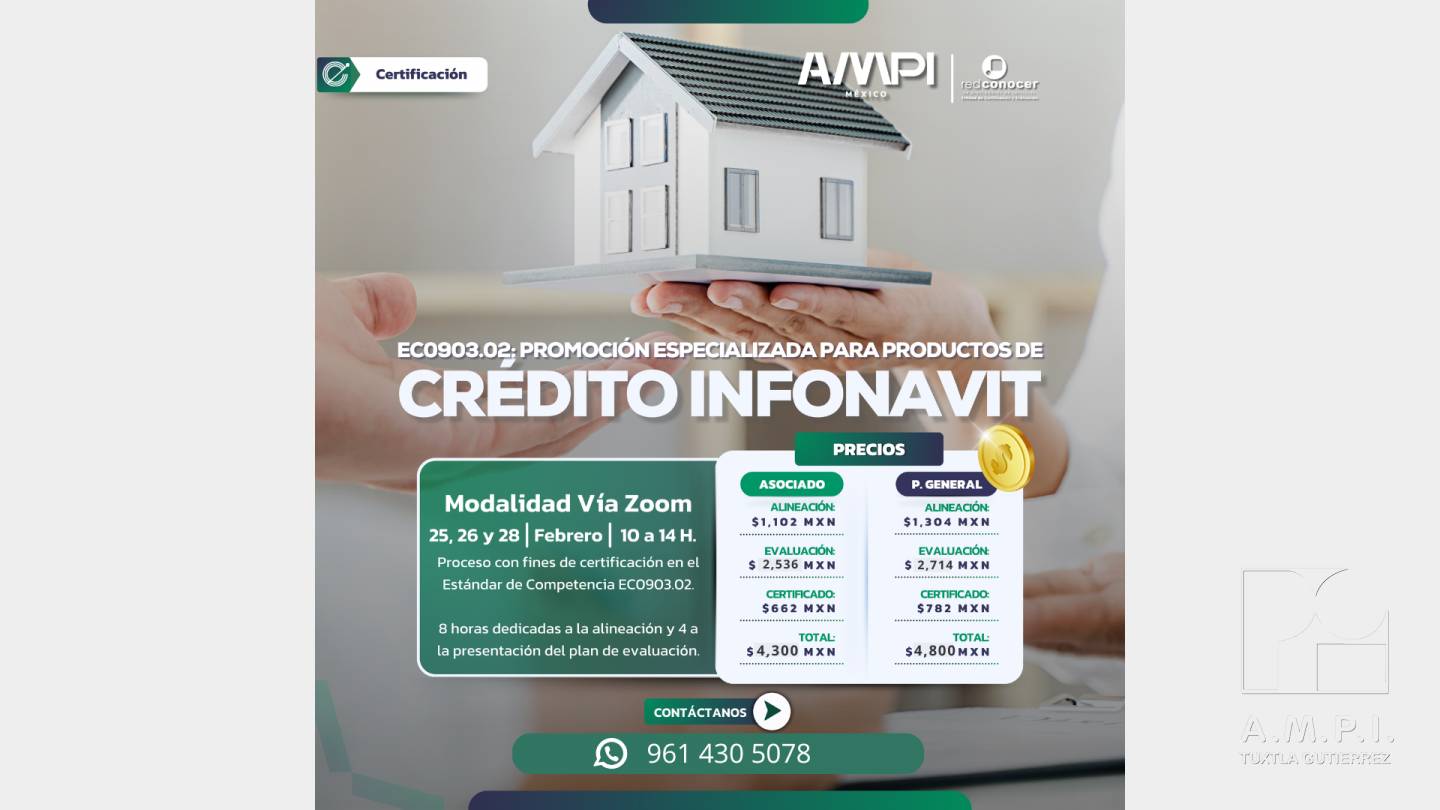 Te invitamos a realizar tu Certificación Infonavit: EC0903.02 “Promoción especializada para productos de crédito INFONAVIT”, que realizaremos POR VIA ZOOM, los días 25, 26 y 28 de febrero 2025, de 10:00-14:00 horas.