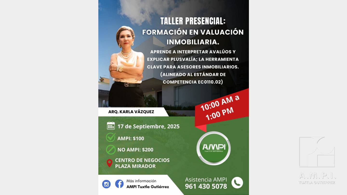 Capacitación en AMPI Tuxtla Gutiérrez. El día 17 de septiembre tuvimos la oportunidad de reunir a más de 40 asesores inmobiliarios comprometidos con su crecimiento profesional, quienes participaron en el taller presencial Formación en Valuación Inmobiliaria.